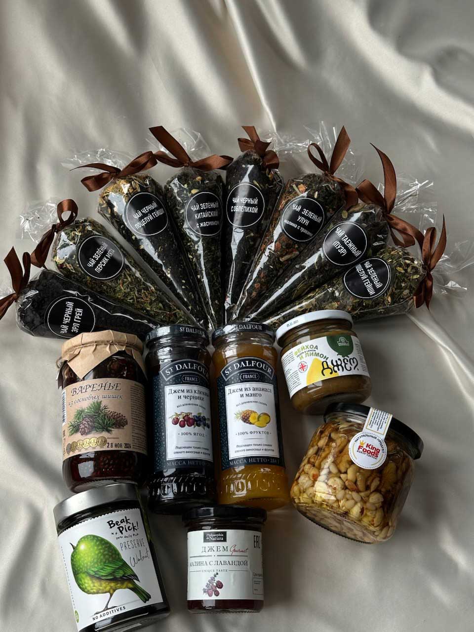 8 видов чая, 7 видов варенья и джема, орехи в меду